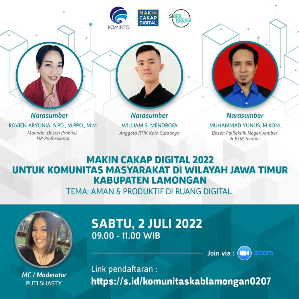 Makin Cakap Digital 2022 : Aman & Produktif di Ruang Digital [Komunitas Masyarakat Lamongan, Jatim] Posted on July 2, 2022July 27, 2022 by admin Deskripsi Dilaksanakan pada 2Juli 2022. Pilar yang dibawakan yaitu Cakap Bermedia Digital dengan topik “Positif, Kreatif & Aman di Internet”. Fliyer