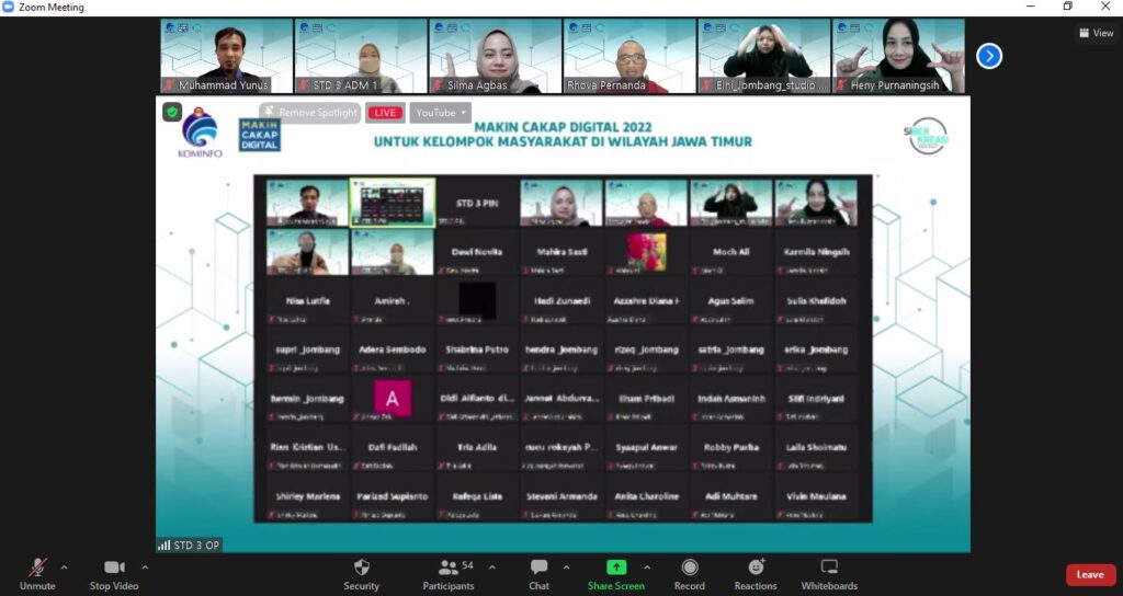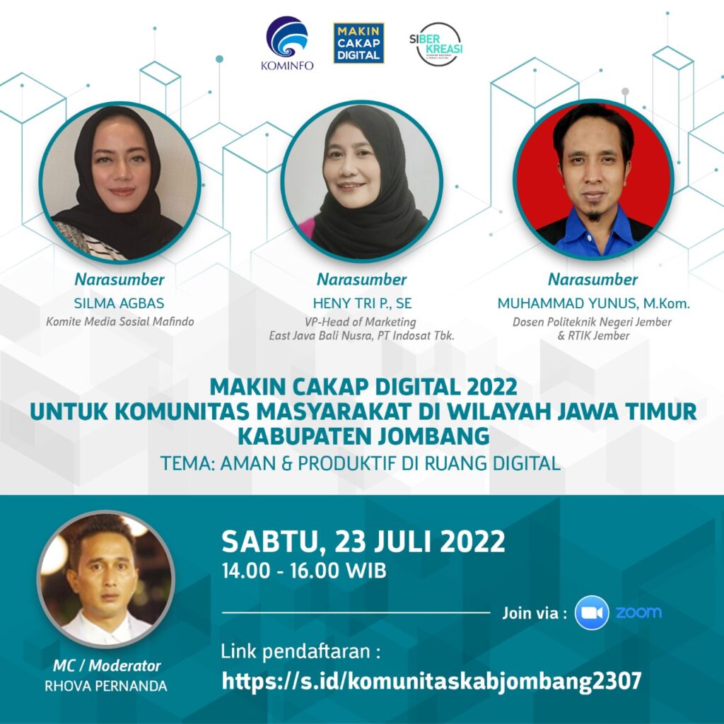 Makin Cakap Digital 2022 : Aman & Produktif di Ruang Digital [Komunitas Masyarakat Kab. Jombang, Jatim] Posted on July 23, 2022July 27, 2022 by admin Deskripsi Dilaksanakan pada 23 Juli 2022. Pilar yang dibawakan yaitu Cakap Bermedia Digital dengan topik “Mengenal Toko Online (Market Place) : Aksesibilitas, Jenis dan Fitur”. Fliyer Dokumentasi Foto Bersama Narasumber dengan Peserta